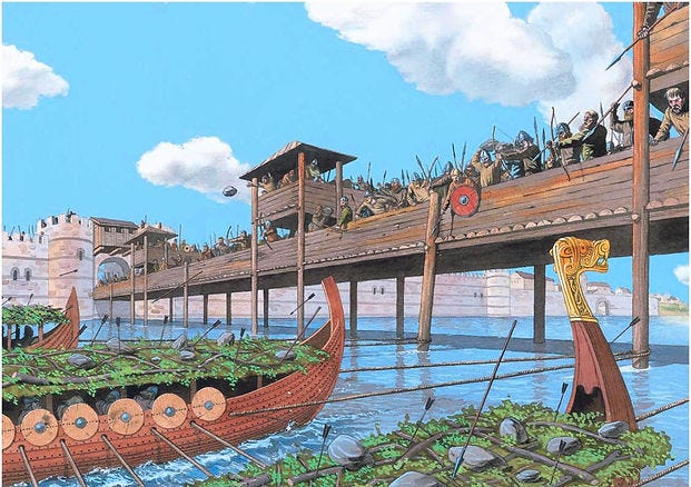 “Olaf, and his fleet with him, rowed right up under the bridge, laid their ropes around the beams which supported it, and then rowed off with all their ships as hard as they could down the river. As the beams under it loosened and broke, the bridge gave way; and a great part of the men upon it fell into the river.”